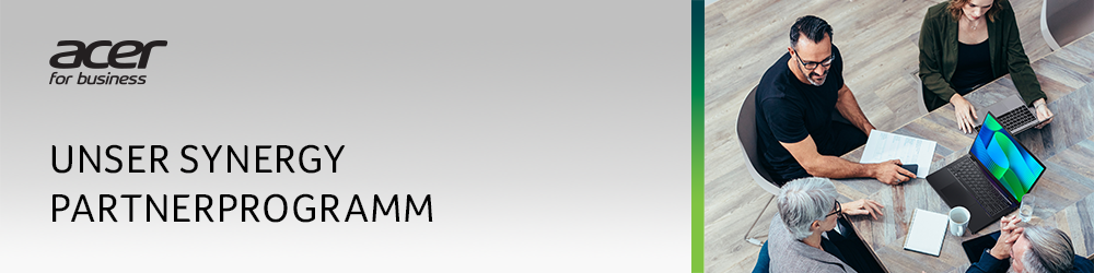 Hier findest du alle wichtigen Infos zu unserem Synergy PartnerprogrammMit dem Synergy Partnerprogramm unterstützen wir dich dabei, Chancen zu erkennen, deinen Erfolg zu steigern und echten Mehrwert zu schaffen. Wir begleiten dich in allen Phasen, damit du die Bedürfnisse deiner Kunden optimal erfüllen und gleichzeitig starke Geschäftslösungen anbieten kannst. Mit diesem speziellen Paket bekommst du einen Überblick über Acers Strategie, unser Produktportfolio und das Synergy Partnerprogramm.